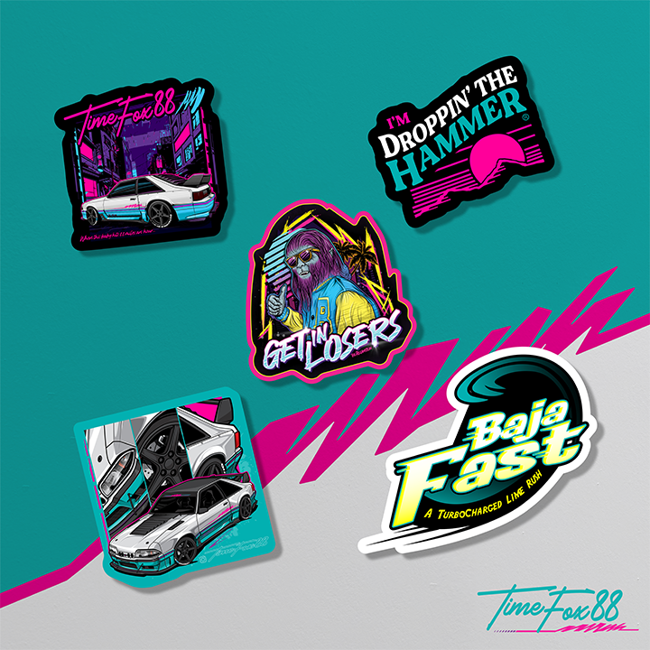 Bring the ultimate retro flair to your collection with the TimeFox88 Retro Vibes Sticker Pack! Featuring five exclusive designs, this pack is filled with 80s and 90s nostalgia, perfect for your ride, laptop, or gear. With a UV and water-resistant glossy finish, these stickers are built to last while adding a pop of vibrant, throwback energy wherever you stick them. Grab a pack and fuel your style with retro-inspired attitude!